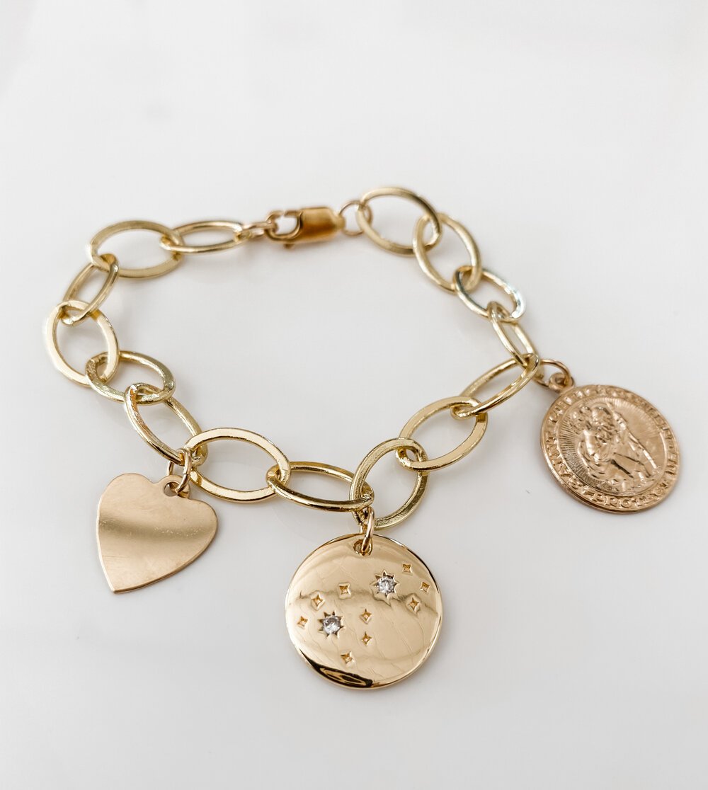 This chunky chain link bracelet is the perfect layering bracelet.It is made of 14k gold filled. Choose your perfect size, measure your wrist.Or leave a custom size in the comments.Choose between the two charm options:option 1:heart, circle start charm, Saint Christopheroption 2:turquoise star charm, gold shell, pearlNOTE: Gold-filled jewelry has a much higher amount of gold in it than gold-plated, making it more valuable (almost 100% more gold than gold-plated jewelry), more durable (won't chip or tarnish), safe for those with metal allergies and longer-lasting (10-30 years).