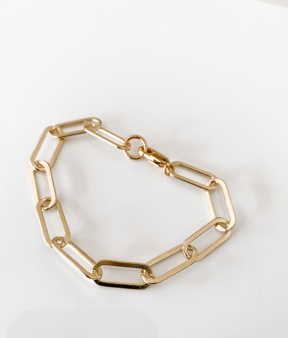 This Zoe thick chainlink bracelet is the perfect layering bracelet. It is made of 14k gold filled. Choose your perfect size.NOTE: Gold-filled jewelry has a much higher amount of gold in it than gold-plated, making it more valuable (almost 100% more gold than gold-plated jewelry), more durable (won't chip or tarnish), safe for those with metal allergies and longer-lasting (10-30 years).