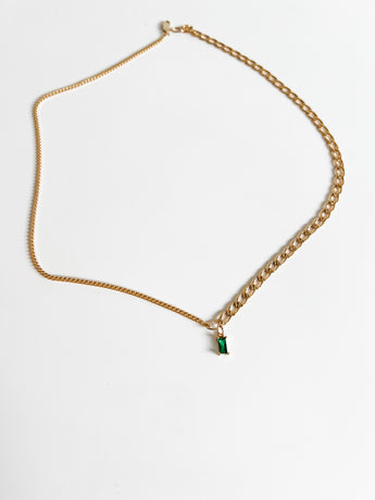 Half Carly Cuban chain and half curb chain with one tiny floating faux emerald stone in the middle!