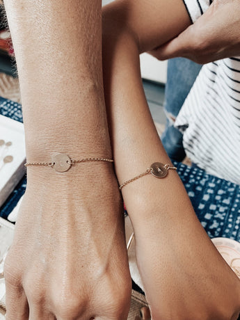 Get the cutest matching bracelet for you and your mini!Lizzie hand makes these bracelets using 14k gold filled chain and disc.Please specify at check out if you chose stamped what letter you want.If you want to measure your littles wrist we recommend using a string and measuring tape and sending their measurement over as well as your own.If not we will send you the most common size for mama and mini.SOLD INDIVIDUALLY Note there is only room for one letter on each.NOTE: Gold-filled jewelry has a much higher amount of gold in it than gold-plated, making it more valuable (almost 100% more gold than gold-plated jewelry), more durable (won't chip or tarnish), safe for those with metal allergies and longer-lasting (10-30 years).