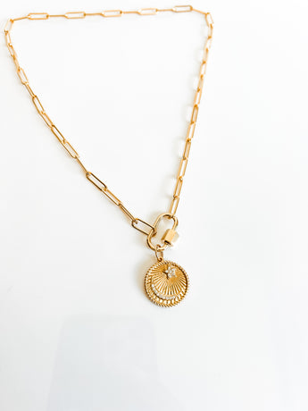 This is the Riley medium paperclip chain paired with the carabiner clasp and a charm.