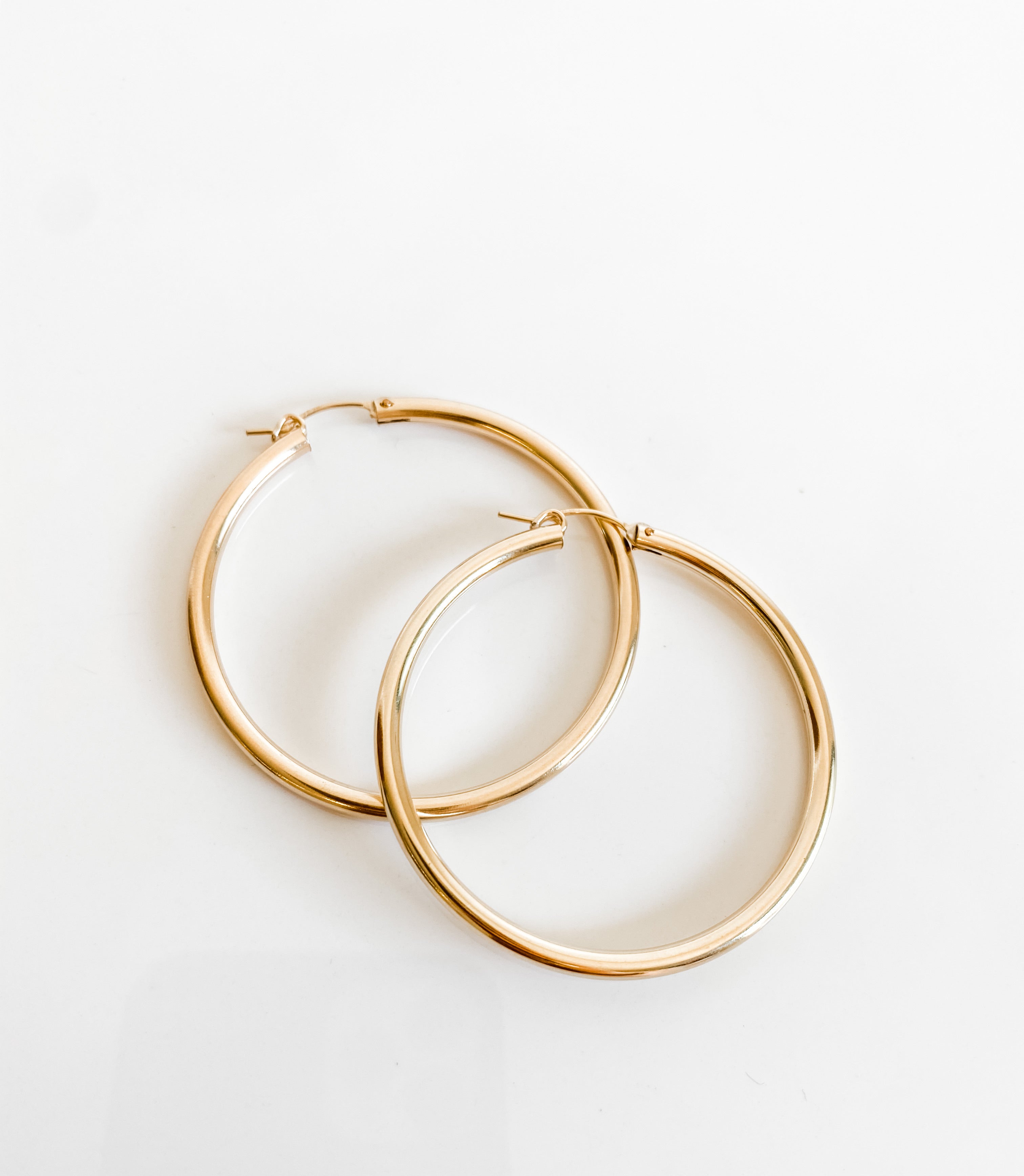 These modern take on your jenni from the block vibe hoops! made from 14k gold filled so they won't tarnish and they are hypoallergenic in the ears sold as a pair GOLD FILLED 50MM FLEX HOOP EARRING
