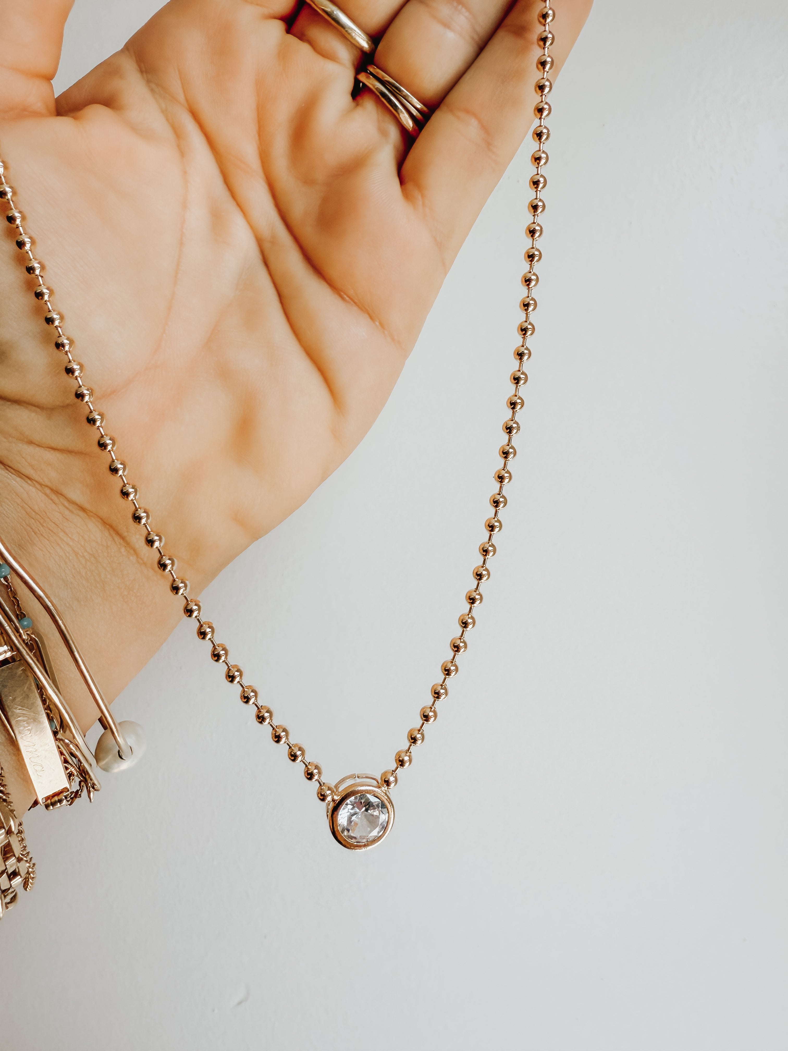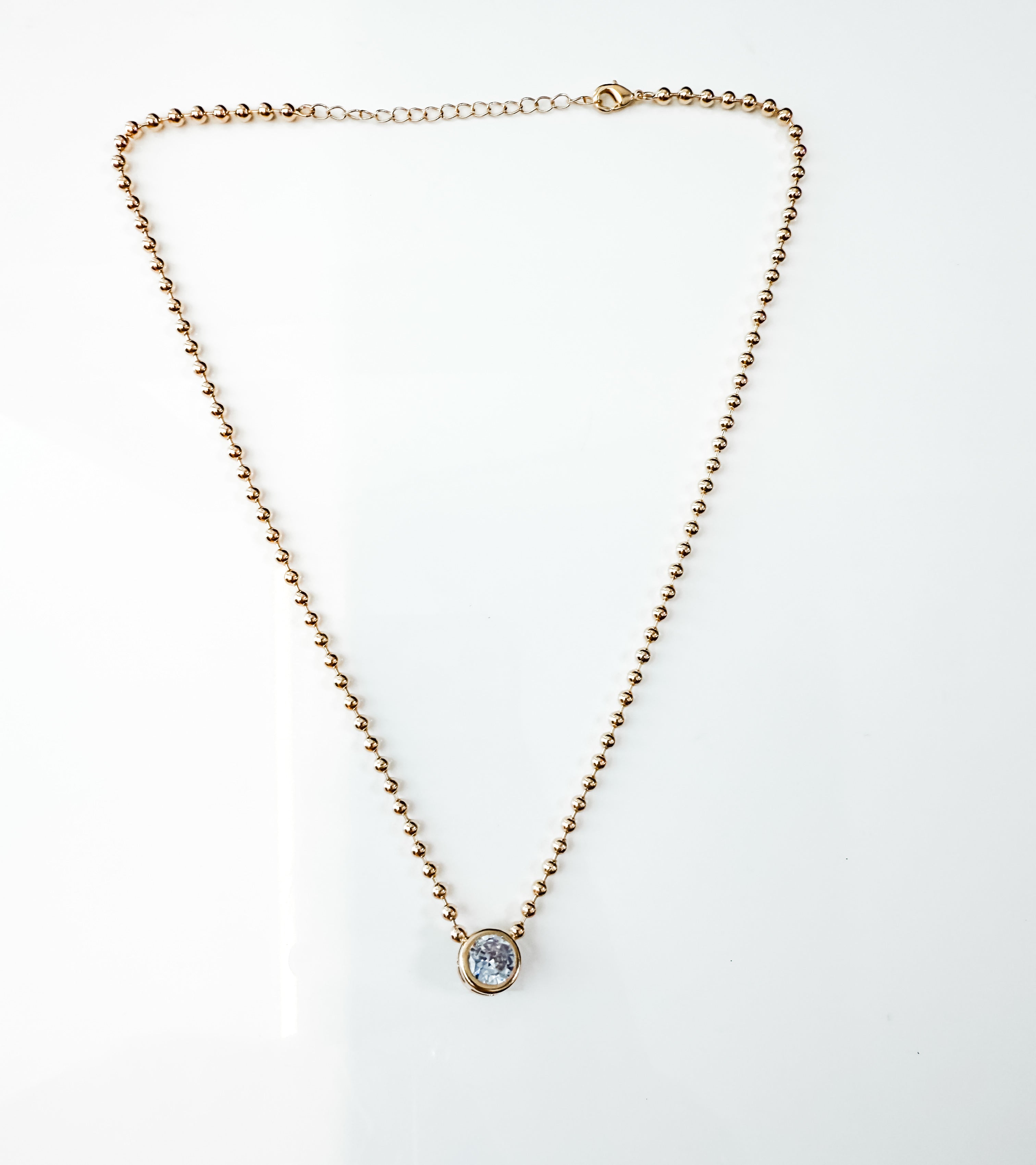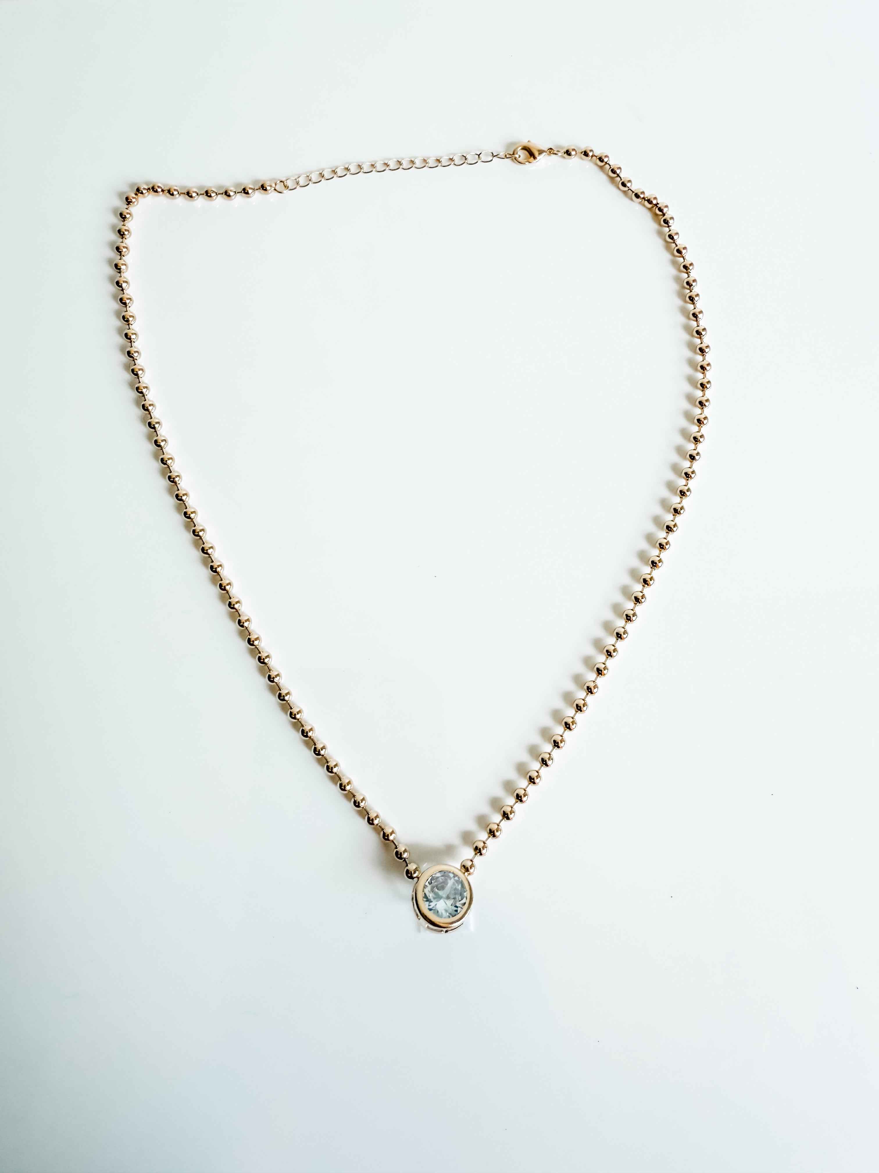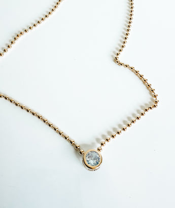 This beaded diamond necklace features a cute bead chain with an 11mm bezel CZ diamond emulating stone.