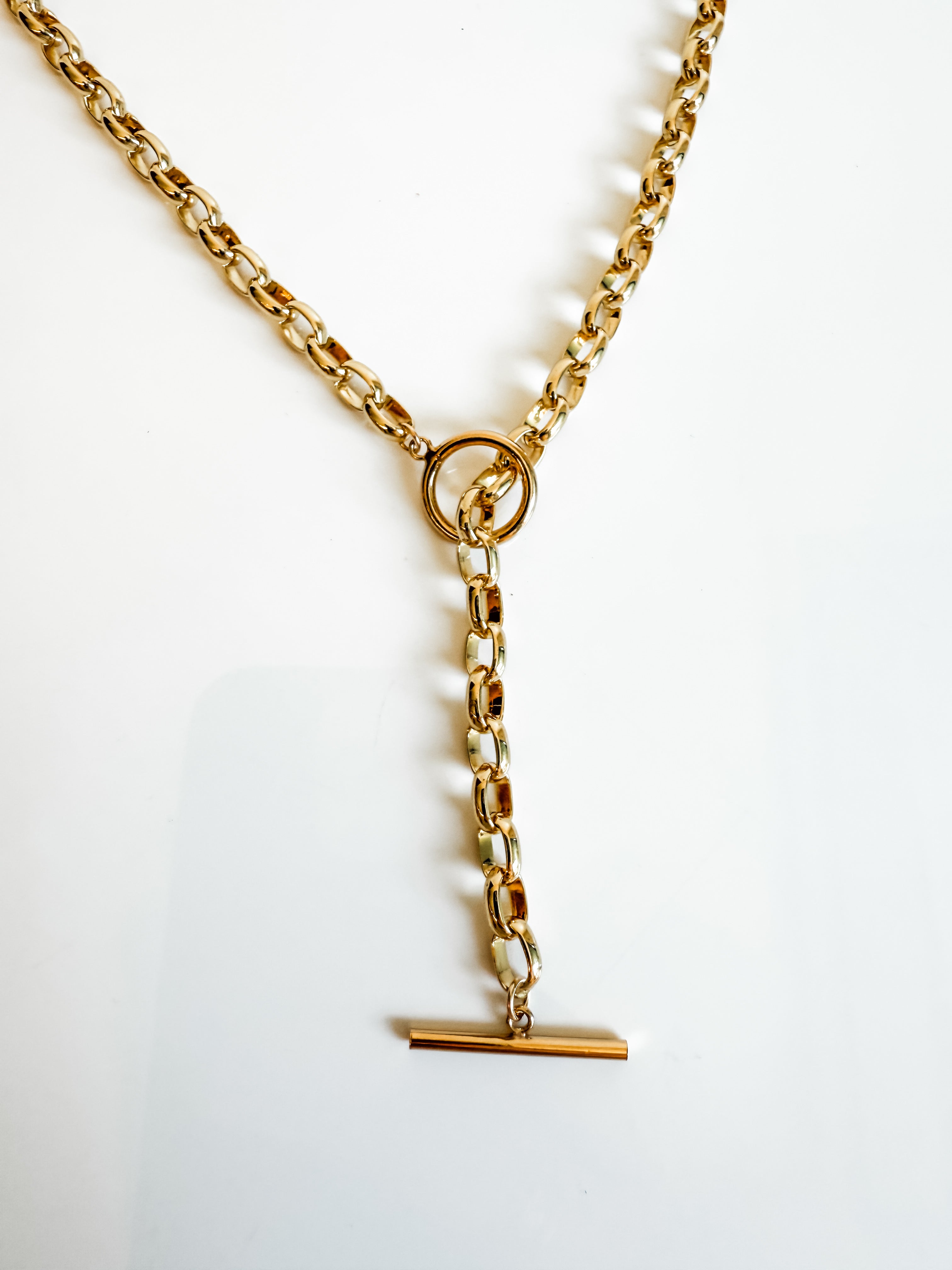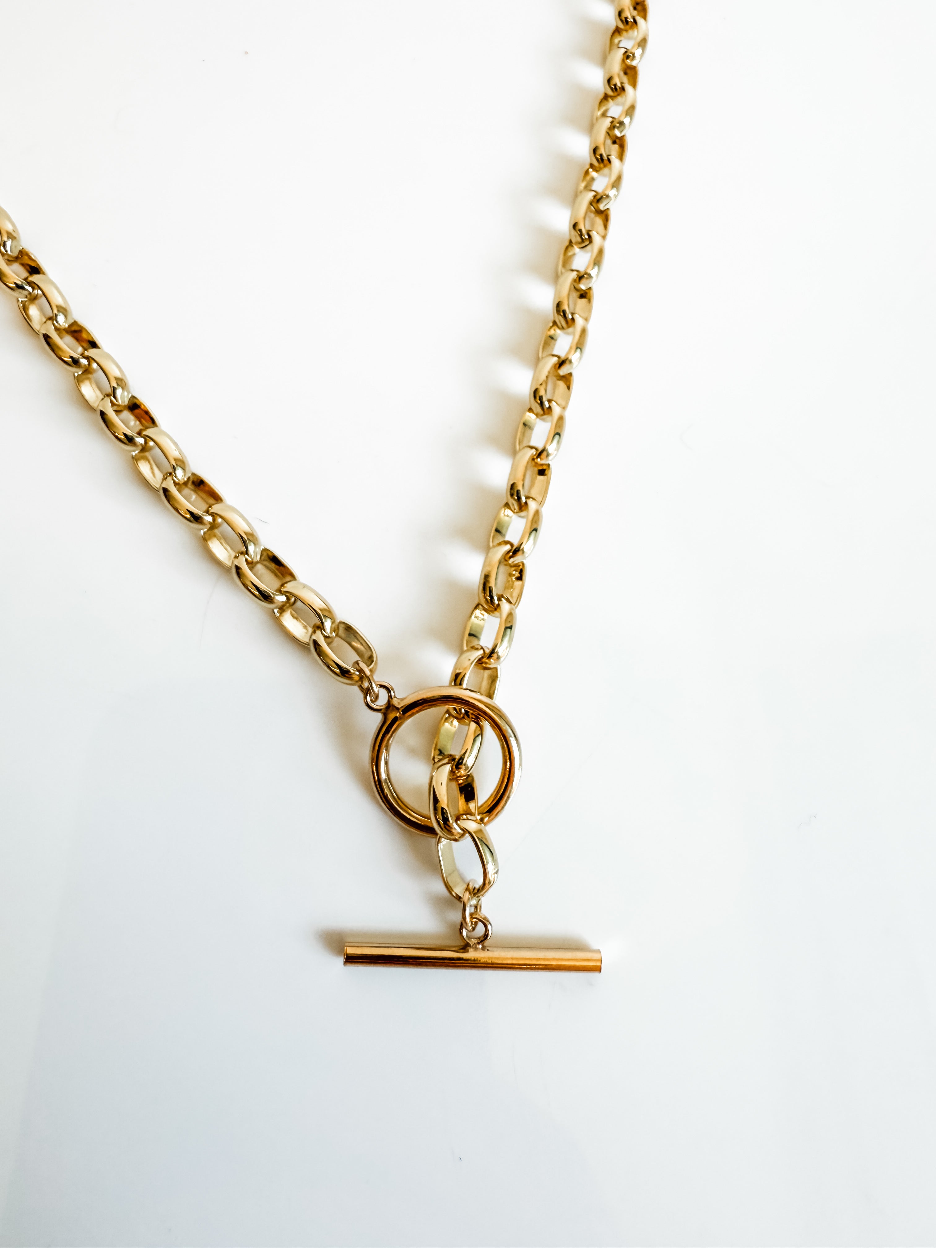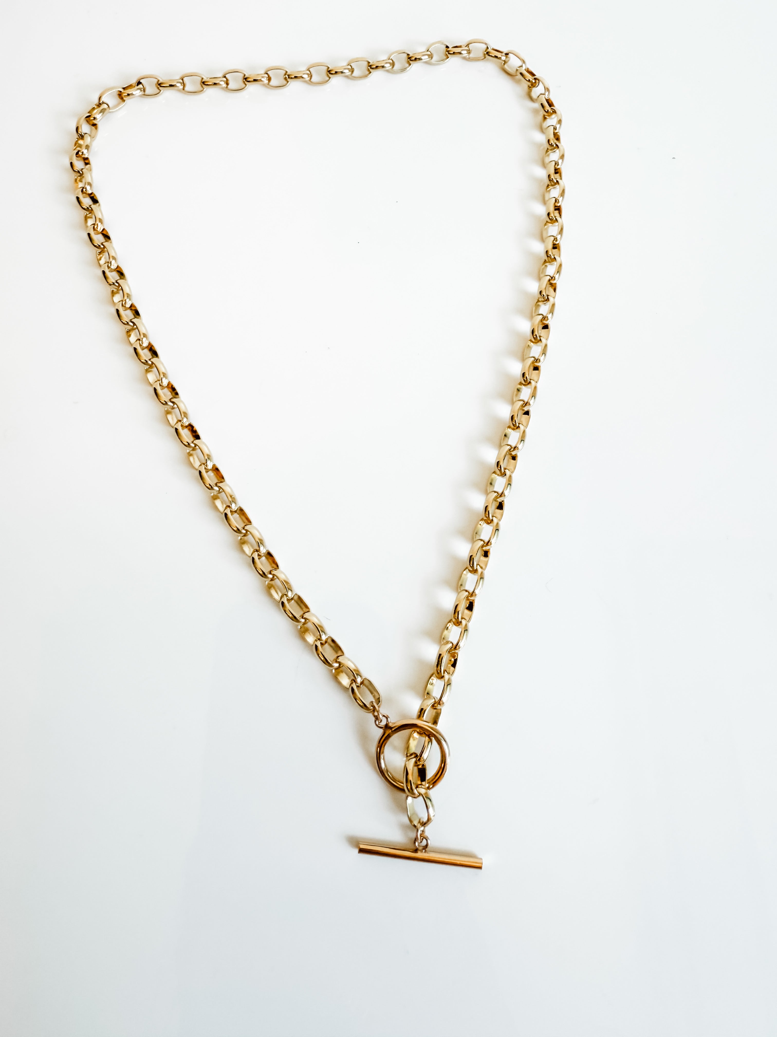 The Madonna chain features a chunky rolo chain with a modern toggle clasp, perfect for adding unique charms to create a personalized look.
