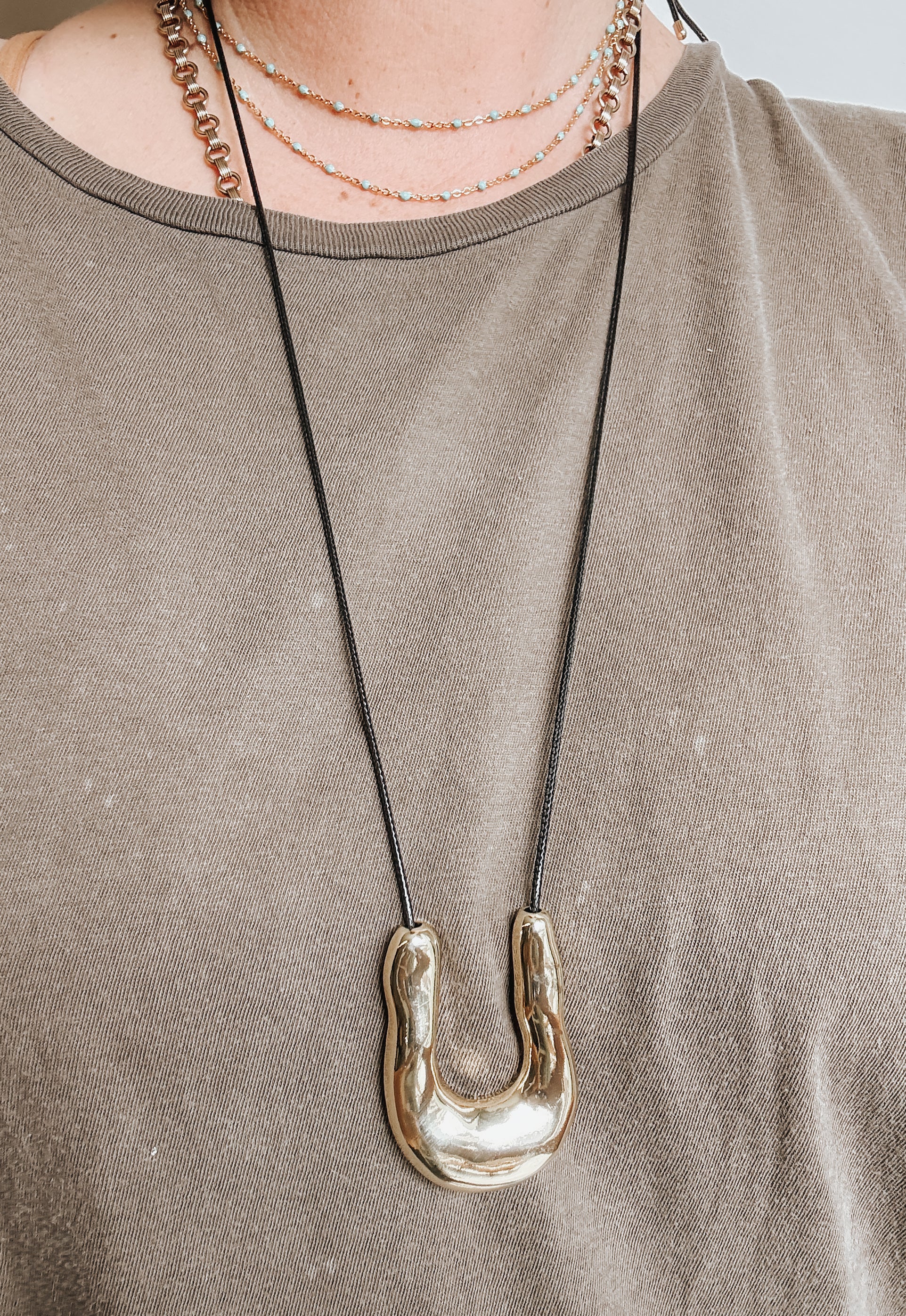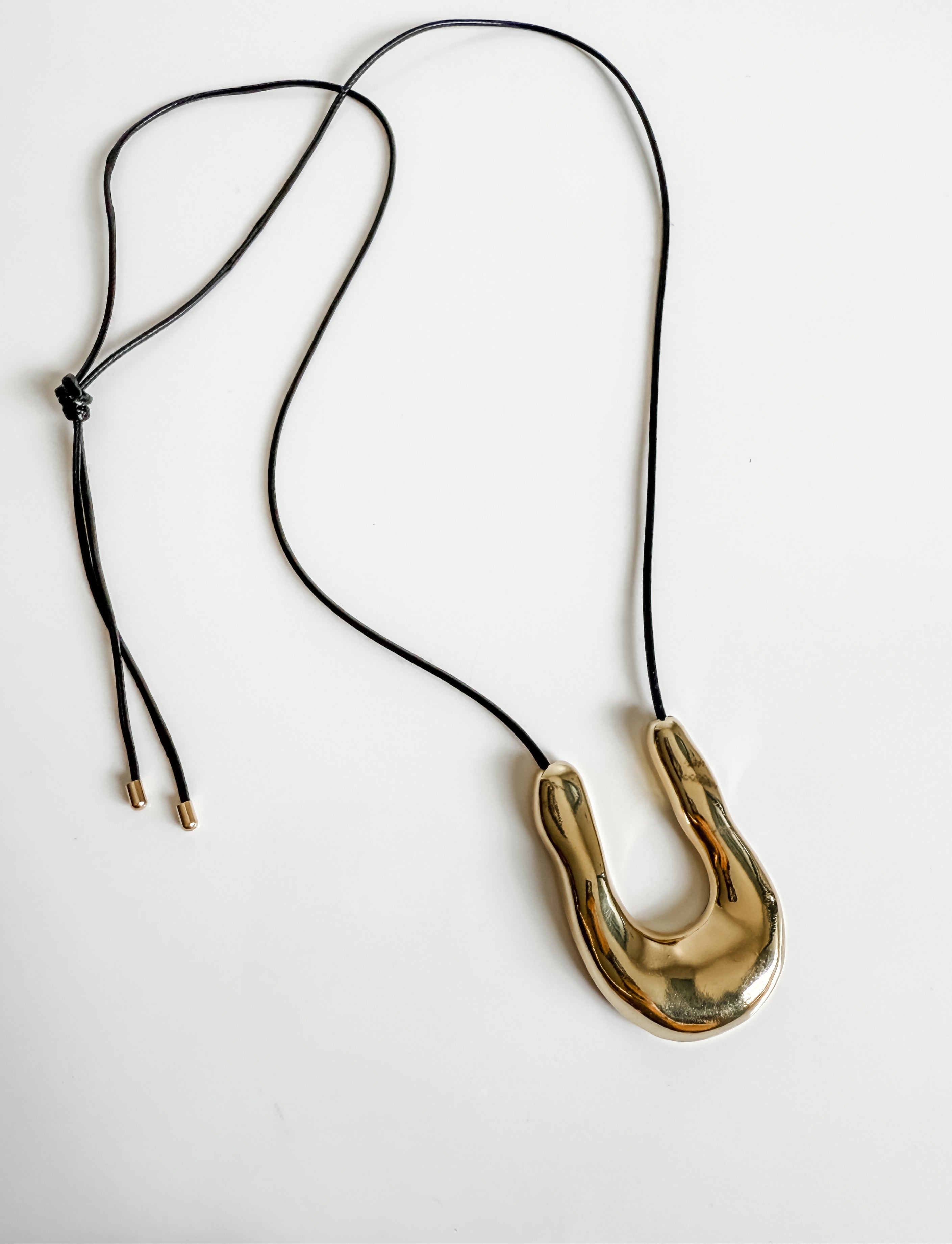 The sIrma leather necklace featuring a graphic gold horseshoe pendant on a long, adjustable leather strap.
