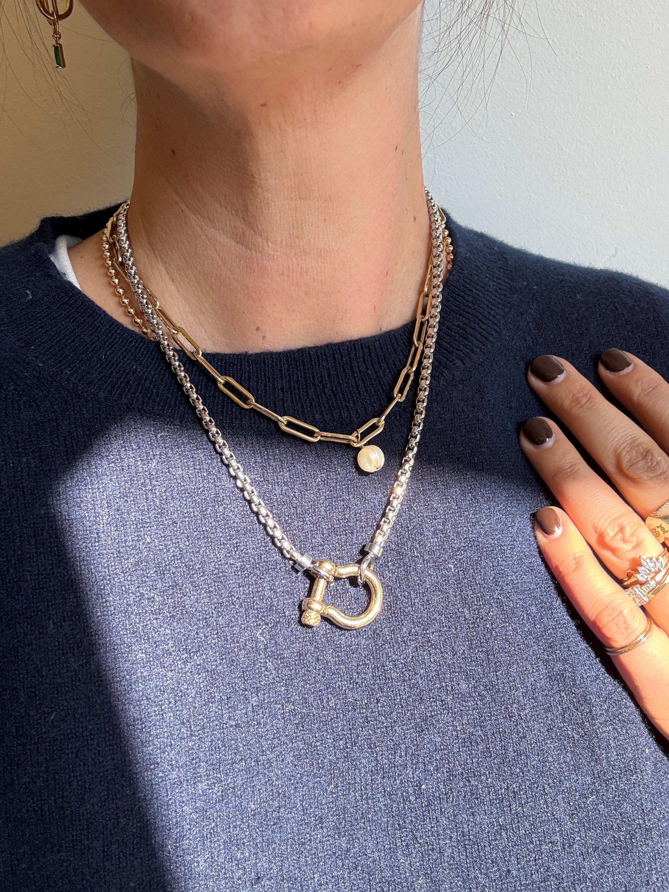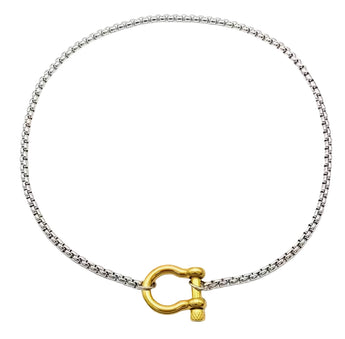 This mixed metal lock and screw necklace is a stylish and unique accessory that will add a cool touch to any outfit.