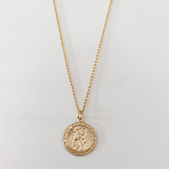 This 14k gold filled Saint Christopher placed onto simple rolo chain.