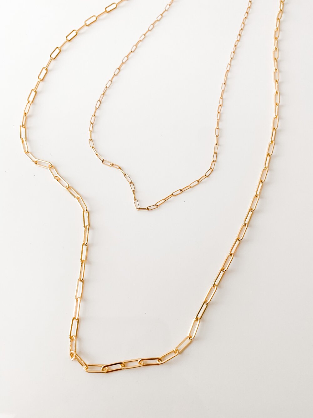 This double paperclip chain stack will instantly elevate your look.Wear it during with the jeans and T-shirt or wear it with your favorite silk slip dress, it's that versatile!jenni mini paperclip chain is 16 inches new Chloe paperclip chain is 18 inches you can request custom lengths in the comments at check out as wellall Components are 14k gold filled