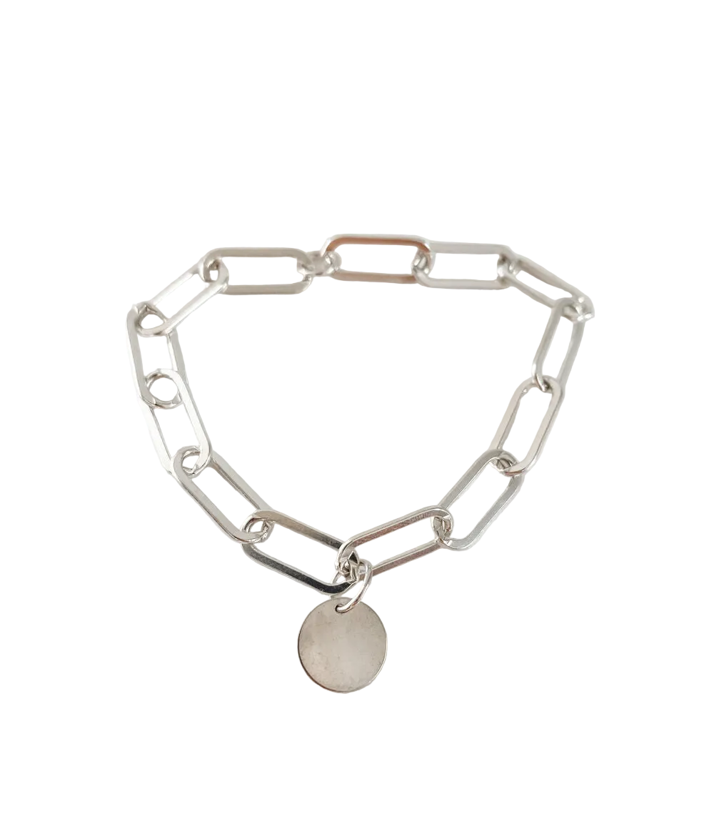 Sterling silver Zoe chain link with small charm.Perfect for engraving one symbol or letter on.please specify your stamping needs in the comments at checkout