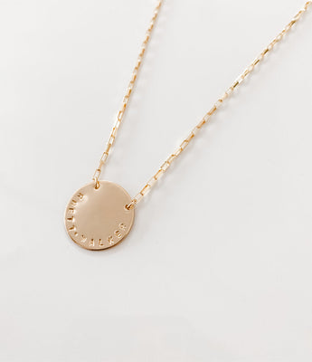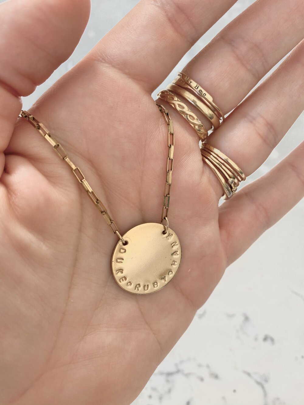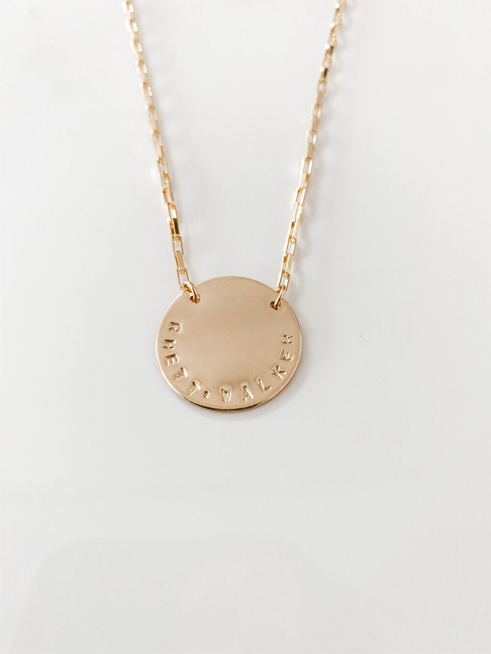 This is the large disc with two holes drilled. Lays so beautiful and flat on the chest. You can stamp all the way around with names or whatever you'd like. please leave stamping details in the comments at check out! NOTE: Gold-filled jewelry has a much higher amount of gold in it than gold-plated, making it more valuable (almost 100% more gold than gold-plated jewelry), more durable (won't chip or tarnish), safe for those with metal allergies and longer-lasting (10-30 years).